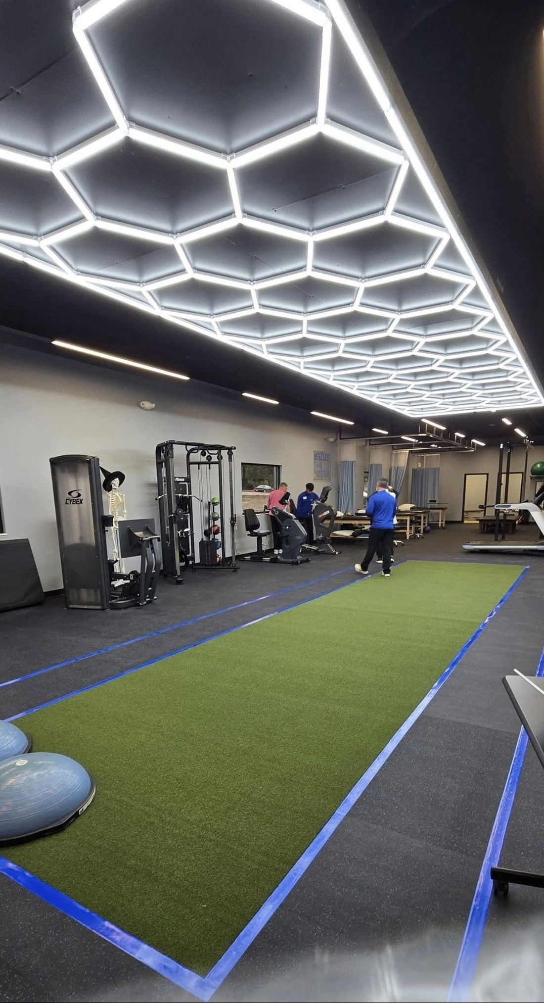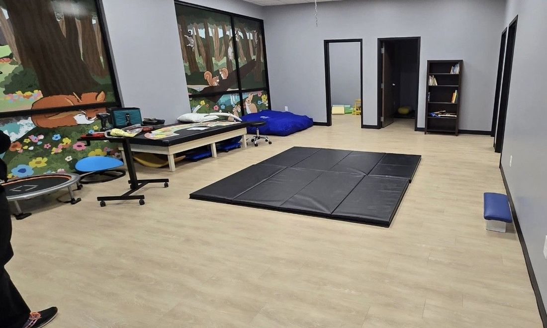 - An expansive main therapy gym featuring a walking track, turf training area, and state-of-the-art equipment, all in a fun, modern atmosphere that’s as energetic as our team!